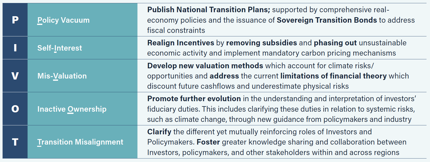 The “policymaker investment dilemma” and the structures that drive it continue to slow effective climate action by perpetuating behaviours and decision-making heuristics that are misaligned with climate goals. Our research has identified five barriers preventing the flow of capital to climate solutions and sets out actions to overcome the barriers and help direct investment towards projects and sectors that will accelerate the world’s transition to a sustainable future. Key actions are included in the table below, with more detail included in the full report.