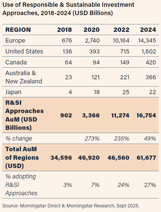 The analysis finds that the value of fund assets reporting the use of responsible or sustainable investment approaches has reached USD$16.7 trillion, increasing by nearly USD$5.5 trillion (49%) over the last two years, using the same Morningstar data approach.