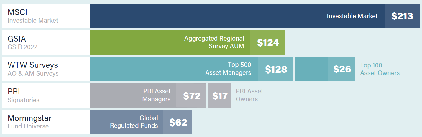 This year’s report was unable to draw on the traditional sources of data – large-scale surveys of fund managers across the world – which accounted for the vast majority of USD$124 trillion AuM covered in previous GSIR reports. To bridge this gap, we have included data from Morningstar, which limits the scope of analysis to legal fund public disclosures made by asset managers, significantly reducing the volume of assets covered (a greater than 50% reduction).